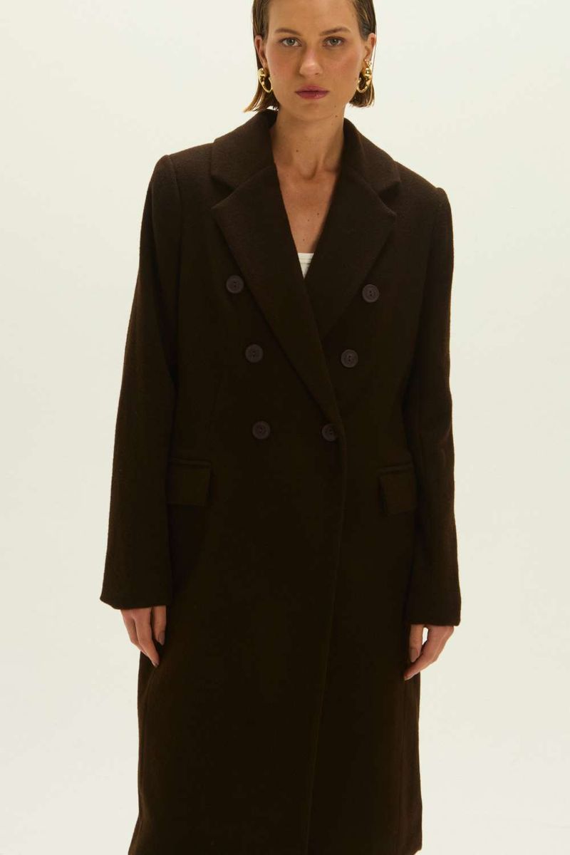 Confeccionado em lã, o casaco possui modelagem alongada com gola lapela e fechamento frontal transpassado com quatro botões aparentes. Possui mangas longas. Apresenta dois bolsos frontais embutidos com detalhe de pesponto aparente nas laterais. O acabamento geral é pespontado.